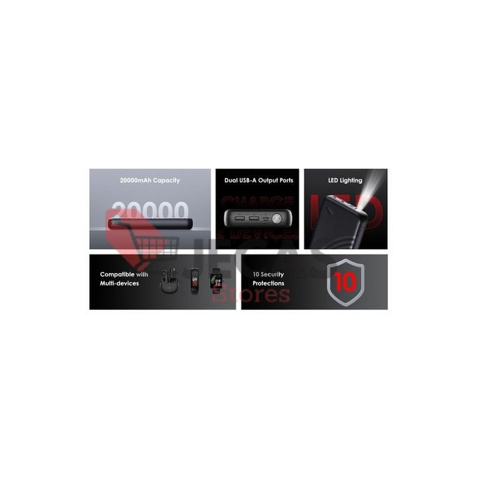 20000mAh Battery CapacityFast Charging Power BankDual USB-A Output Ports: Charge 2 devices at the Same TimeLED LightingCompatible with Multi-devicesPremium Battery, Safety Quality