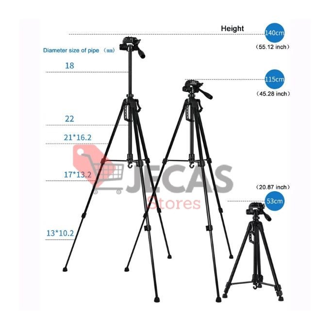 Tripod Specifications:Maximum height: 105cmMinimum height: 34cmFolded length: 36cmMax Tube Diameter: 16.8mmPhone holder adjustable width: 52-85mmThickness: Max.18mmMaximum tripod load: 2.5kgScrew size: 1/4 ”Silver colorMaterial: aluminum