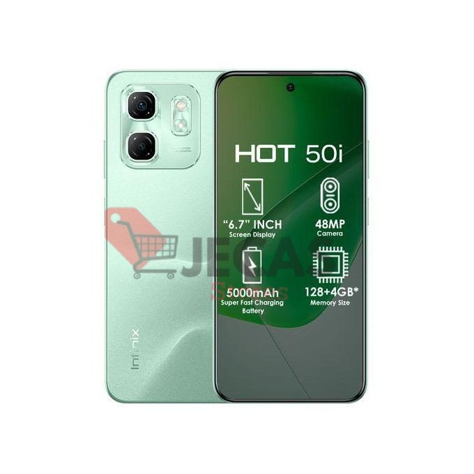 Connectivity options include dual-band Wi-Fi, Bluetooth, and FM radio, all powered by a robust 5000mAh non-removable battery that supports 18W wired charging, reverse wired charging, and bypass charging. Available in Sleek Black, Sage Green, and Titanium Grey, the Infinix Hot 50i balances performance with attractive aesthetics.