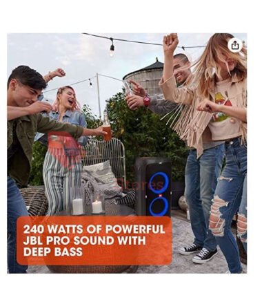 Enjoy Bluetooth wireless music streaming and party lighting nearly anywhere with the JBL PartyBox 310 Portable Bluetooth Speaker. Bluetooth connectivity also allows you to pair two compatible speakers together, or you can daisy-chain multiple speakers and systems with the 1/8″ input and output. The PartyBox 310 features a 1/8″ audio input for traditional wired devices and a USB input for playback from compatible drives, as well as two 1/4″ microphone jacks, one of which can instead be used as an electric guitar input.