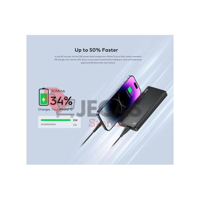 In just 30 minutes, the itel 12W power bank charges your iPhone 12 up to 34%, while a standard 5W charger only reaches 16%. Enjoy a quick power boost before heading to work and experience speed and efficiency like never before!